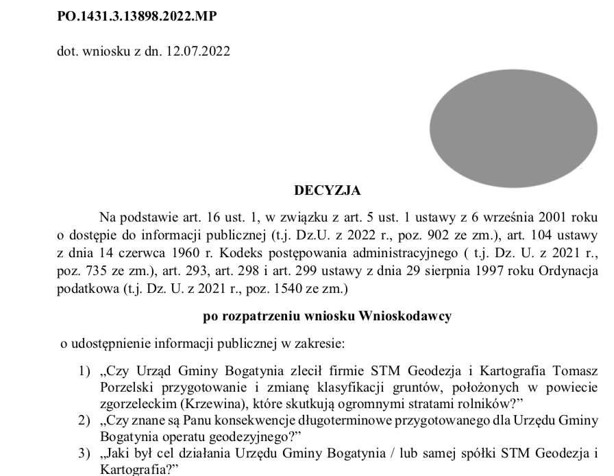 W dniu 13 lipca br nasza redakcja skierowała zatem do Burmistrza Miasta i Gminy Bogatynia – Pana Wojciecha Dobrołowicza oficjalne pismo z pytaniami: o to czy zlecił firmie STM Geodezja i Kartografia wykonanie takiej usługi, czy znane są Urzędowi konsekwencje długoterminowe przygotowanego dla Urzędu Gminy Bogatynia operatu geodezyjnego, w końcu czy Urząd zdaje sobie sprawę z odpowiedzialności jako organu publicznego, który zmienia przeznaczenie gruntów, wpływając na decyzje podatkowe?
