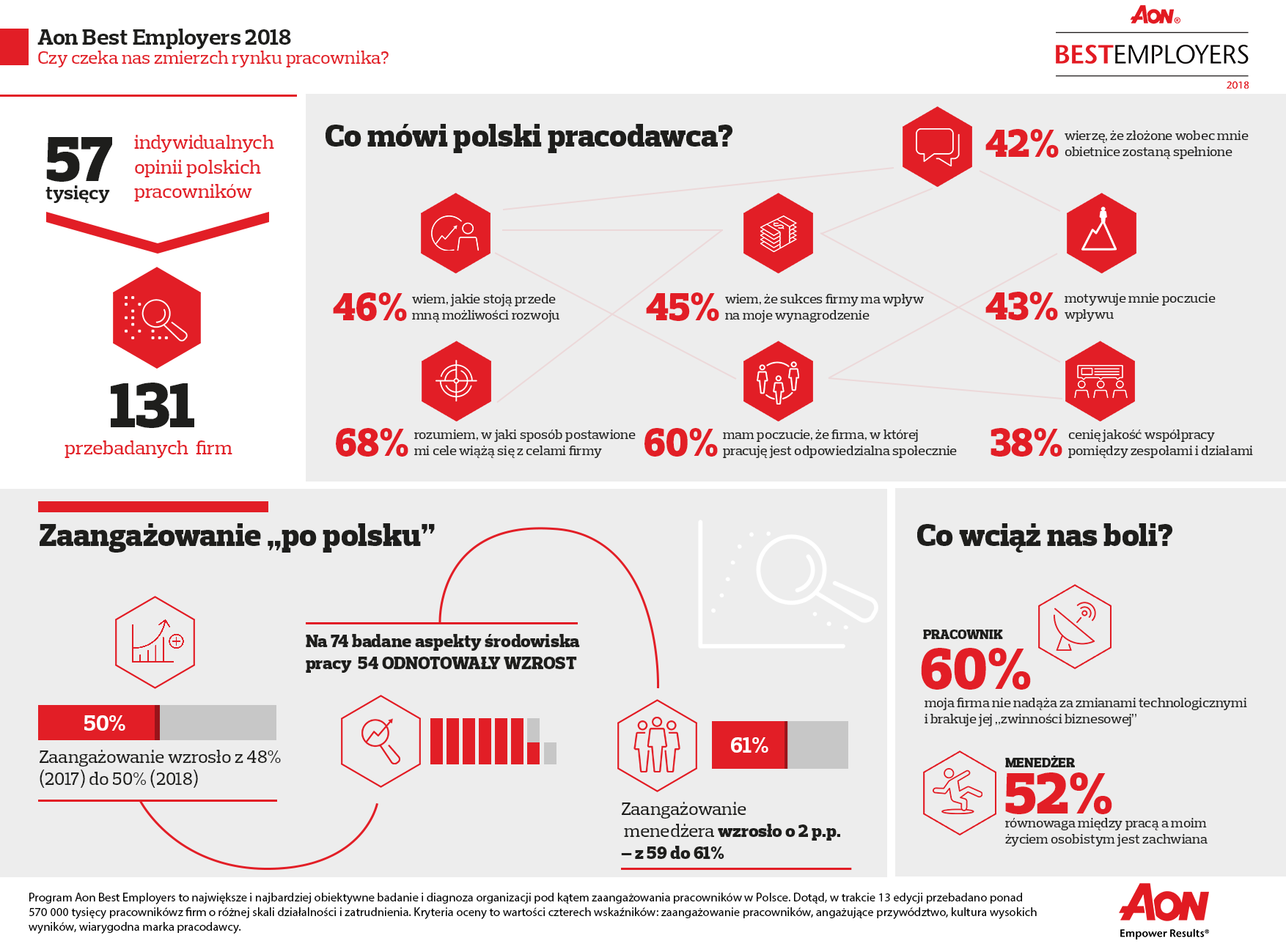 Połowa Polaków jest zaangażowana – to wniosek płynący z corocznego badania Aon Best Employers. Czujemy się bezpieczniej i stabilniej. To odwrócenie trendu z 2017 roku, kiedy lojalność, poczucie wpływu czy chęć pozytywnego mówienia o firmie zanotowały znaczące spadki. Polski pracownik zaczyna dostrzegać starania swoich pracodawców, co ma bezpośrednie przełożenie na korzyści wizerunkowe dla firm. Badanie Aon Best Employers przeprowadzone zostało na grupie ponad 57 tysięcy respondentów ze 131 polskich firm.