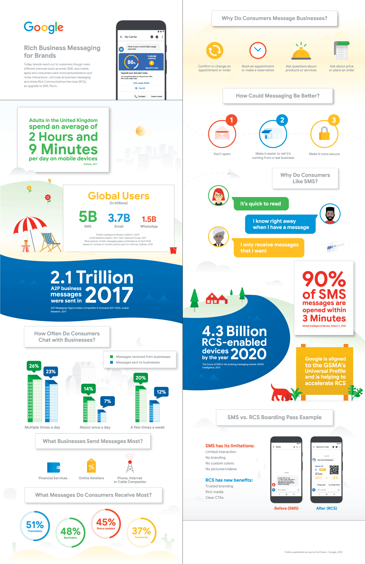 W Polsce, według badań Platformy SerwerSMS.pl, ze smartfonów (bo to one będą obsługiwać nowy standard wiadomości) korzysta aż 86,2 proc. użytkowników telefonów komórkowych. Tak duża grupa osób to wielki potencjał reklamowy i komunikacyjny, szczególnie, że telefony towarzyszą nam na każdym kroku, a używamy ich przez znaczną część dnia – od 2h 9 min dziennie, jak np. w UK, przez 3,3h jak w USA, po nawet 4h 48 min jak w Brazylii. Firmy na całym świecie aktywnie wykorzystują ten potencjał, w efekcie czego tylko w roku 2017 wysłały 2,1 biliona wiadomości biznesowych w modelu A2P.